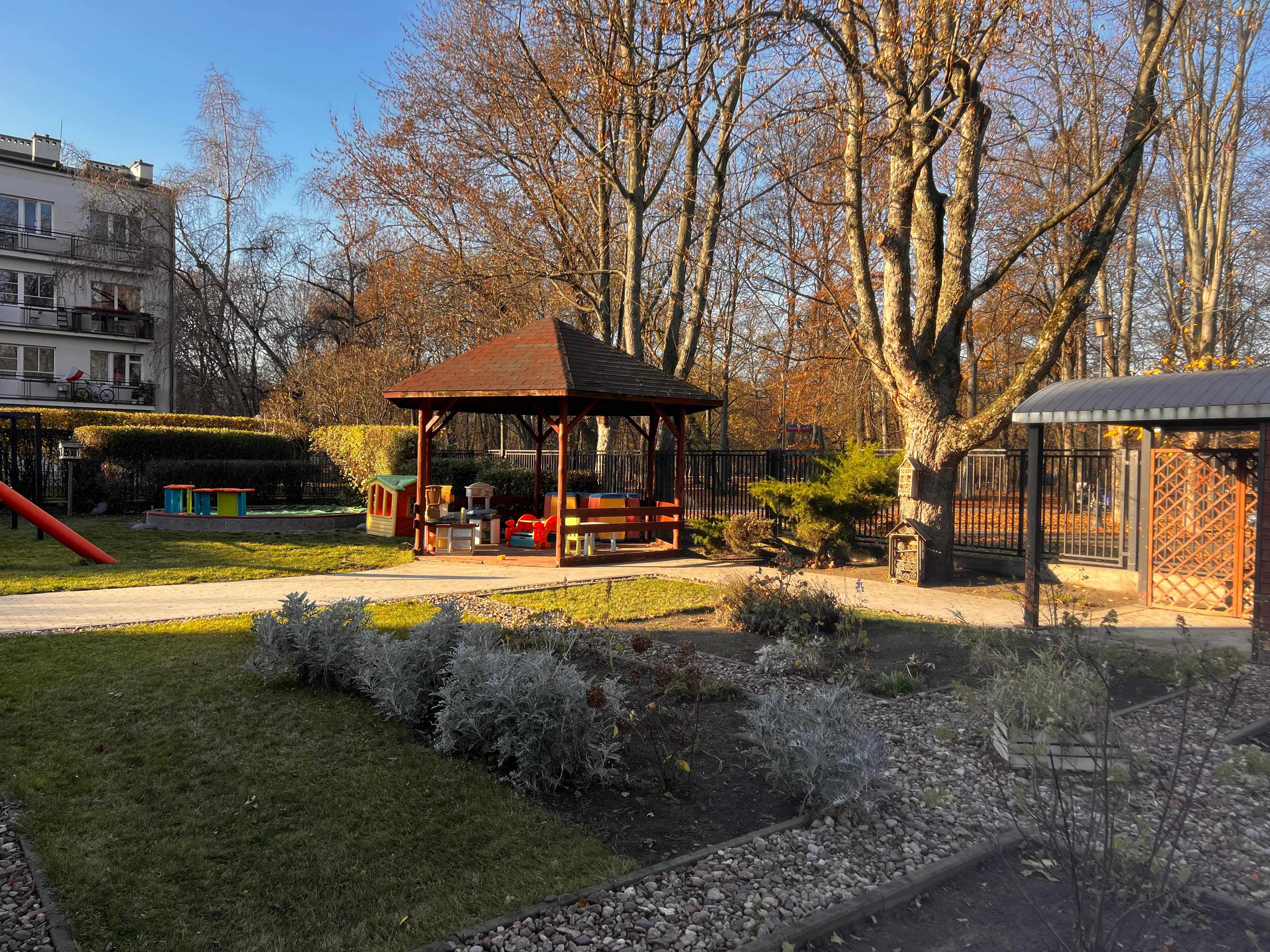 Na terenie znajdują się dwa place zabaw przeplatane zielenią, z podziałem dla dzieci młodszych i starszych, wyposażone w ekologiczny, różnorodny sprzęt ogrodowy, sprzyjający rozwojowi ruchowemu dzieci. Podłoże wyłożone miękkim tartanem. Do dyspozycji dzieci mają: piaskownice, zjeżdżalnie, przeplotnie dostosowane do wieku dzieci, górki wspinaczkowe, dżungle, sprzęt do integracji sensorycznej, rowerki biegowe, kaski, leżaczki, taczki oraz liczne mniejsze zabawki ogrodowe.