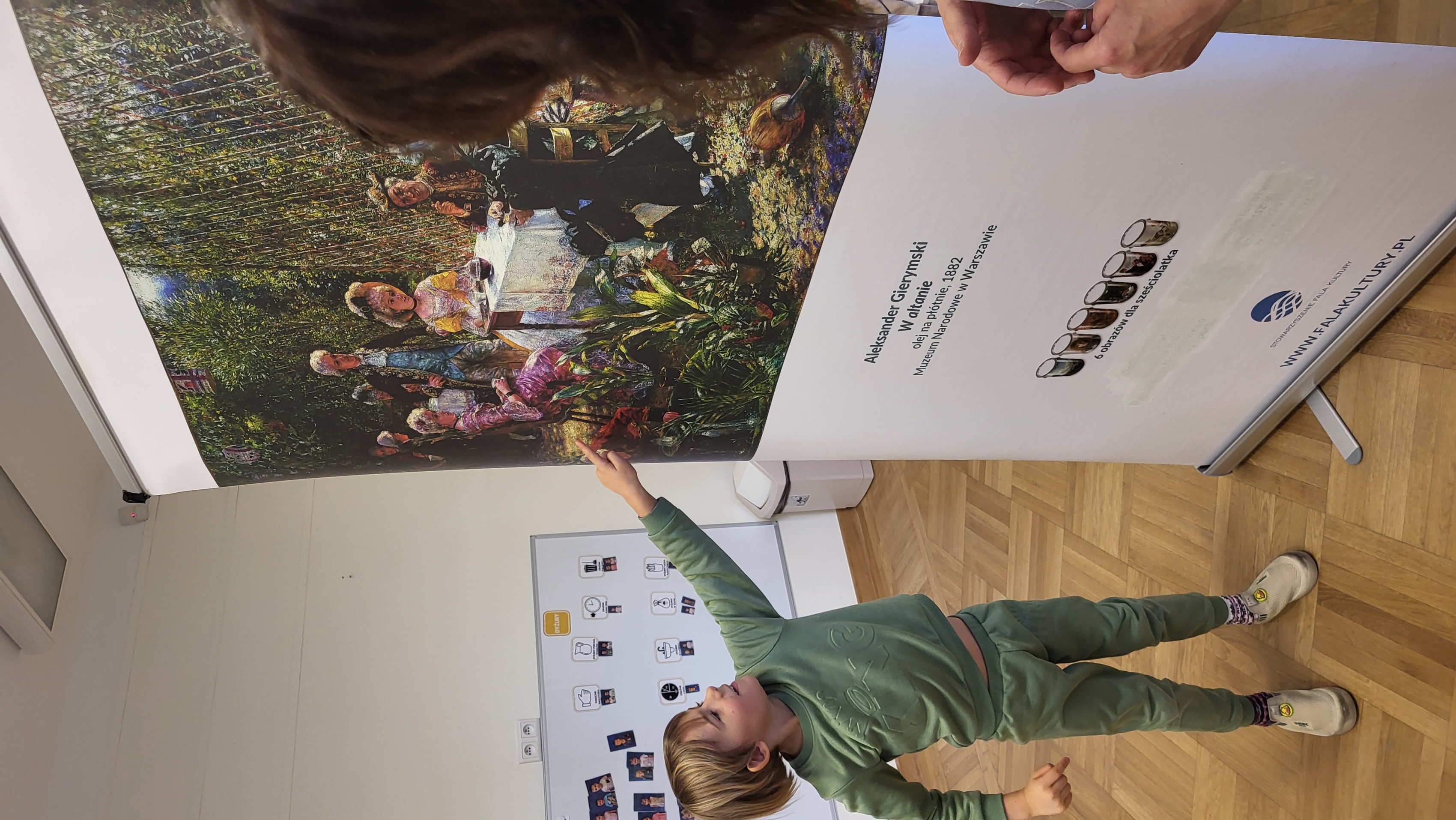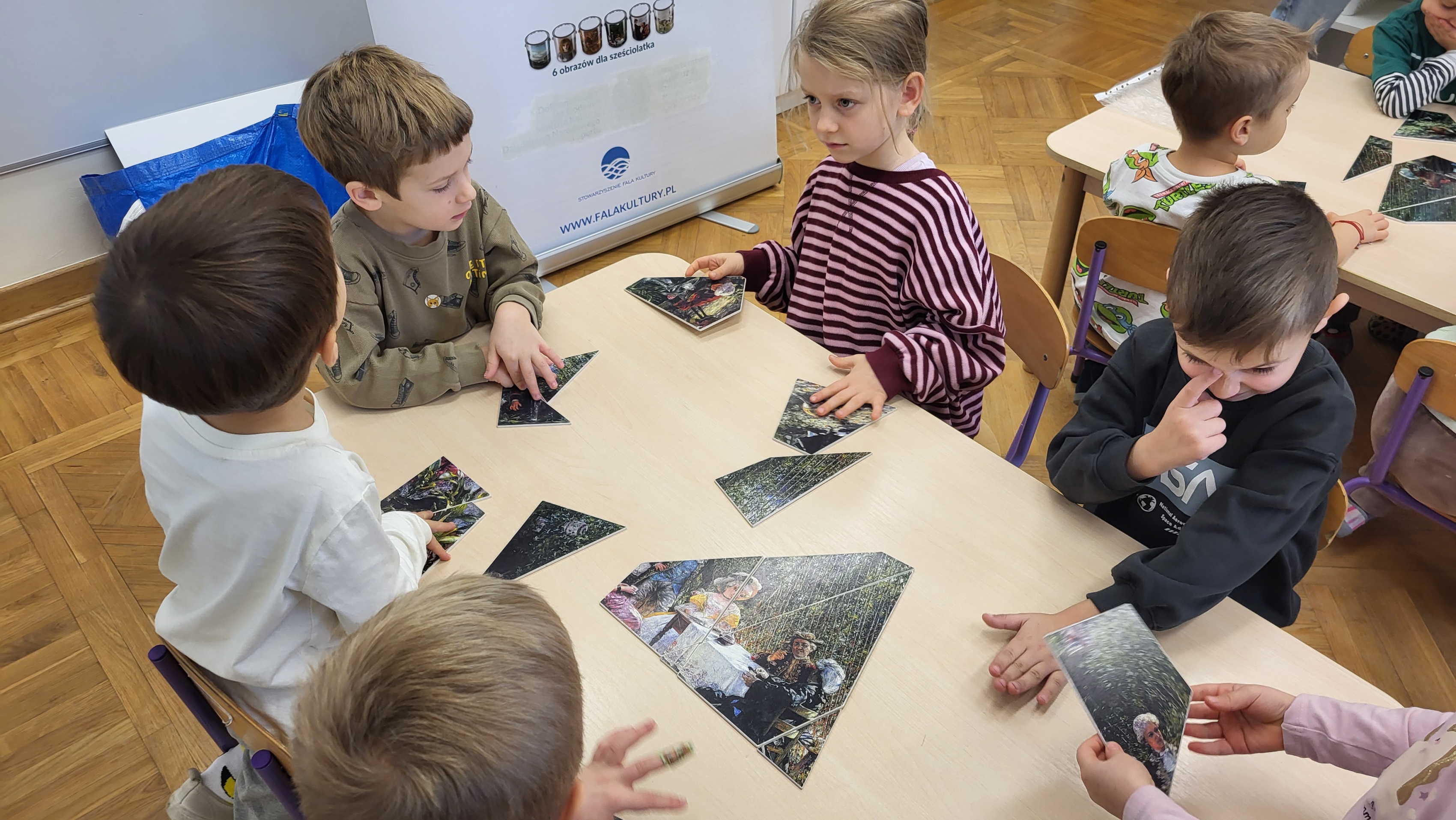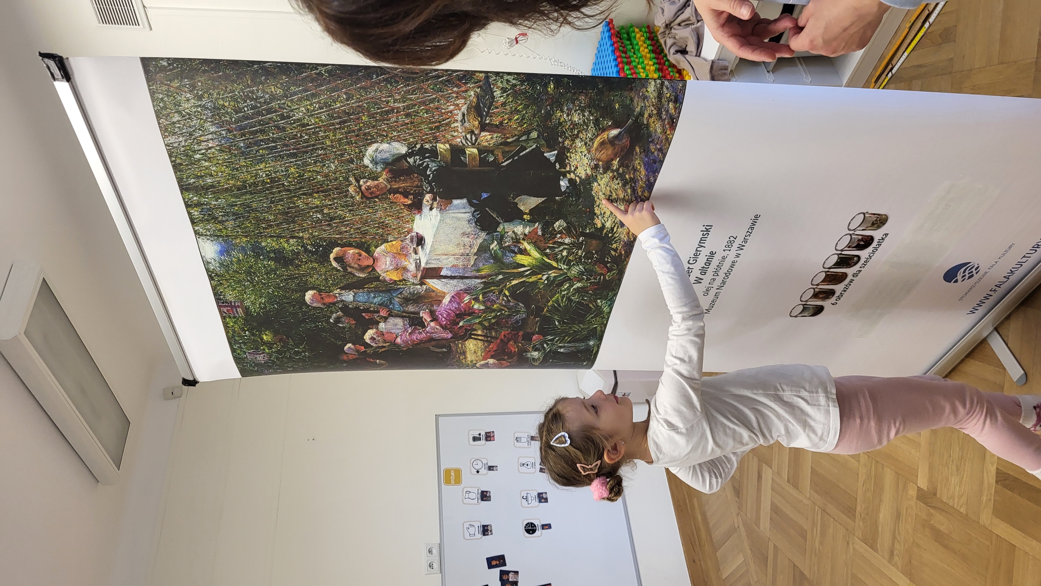 Podczas kolejnego spotkania w ramach projektu „ 6 obrazów dla 6 latka” dzieci poznały obraz Aleksandra Gierymskiego „W altanie”. Informacje o obrazie, artyście, który go stworzył i stylu, w jakich powstał są odkrywane przez dzieci w trakcie zabawy. W tym przypadku dzieci miały za zadanie ułożyć w grupach kopię obrazu z kilkunastu drobnych kawałków. Była to także doskonała nauka współpracy w zespole.