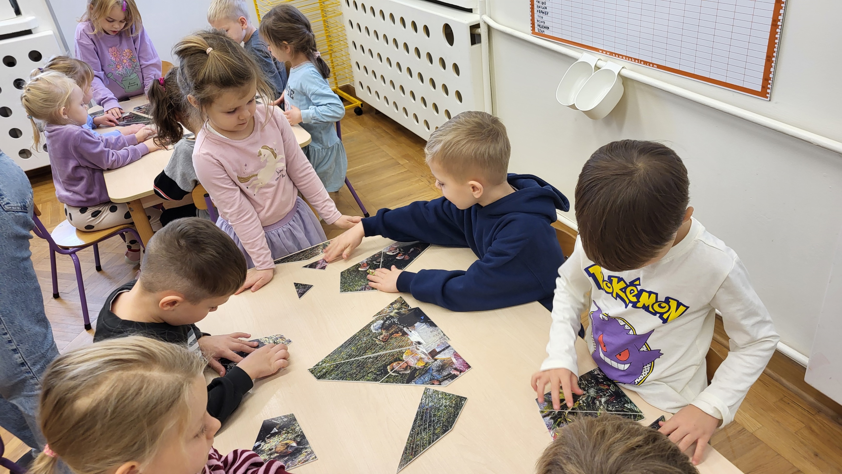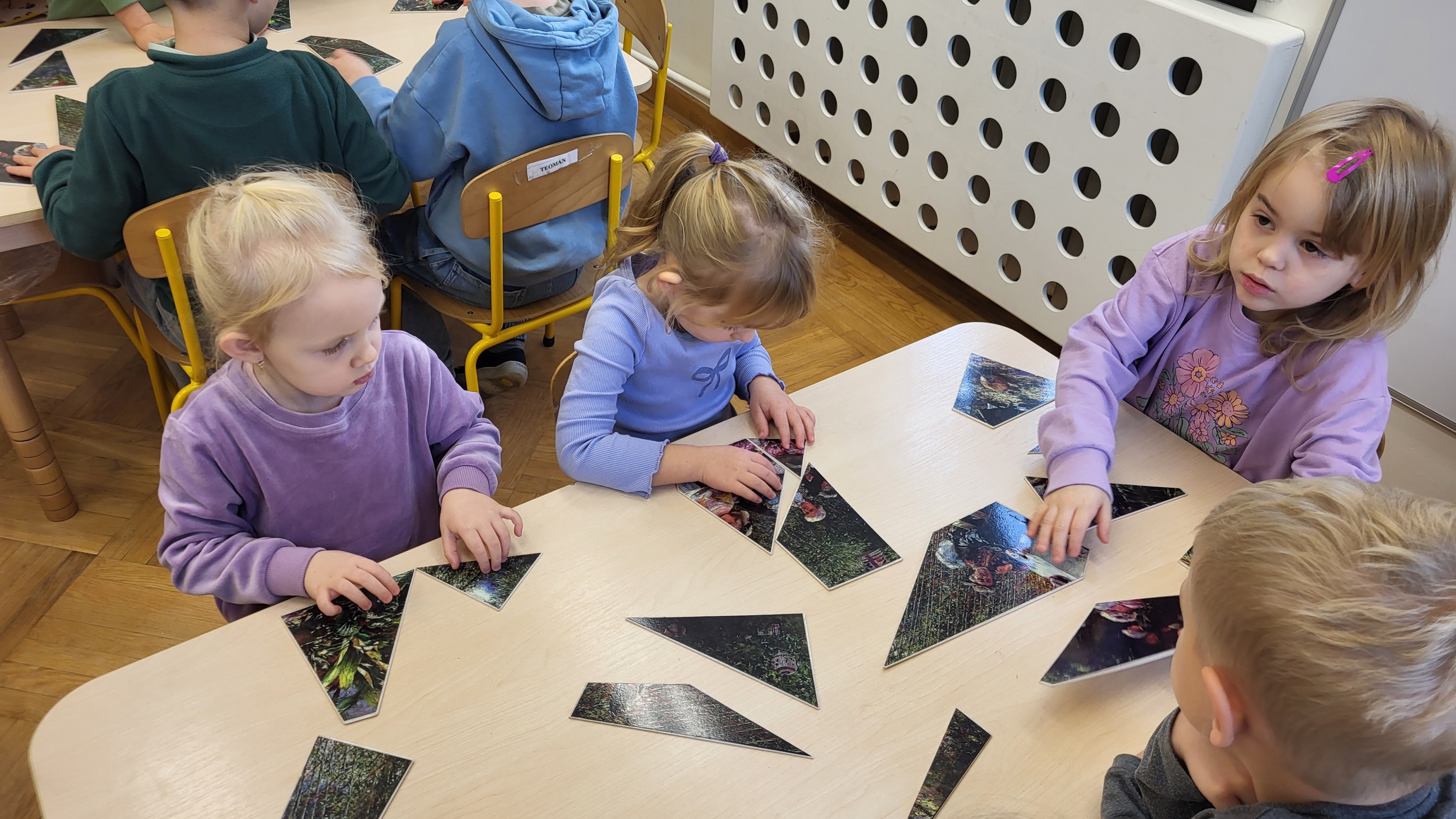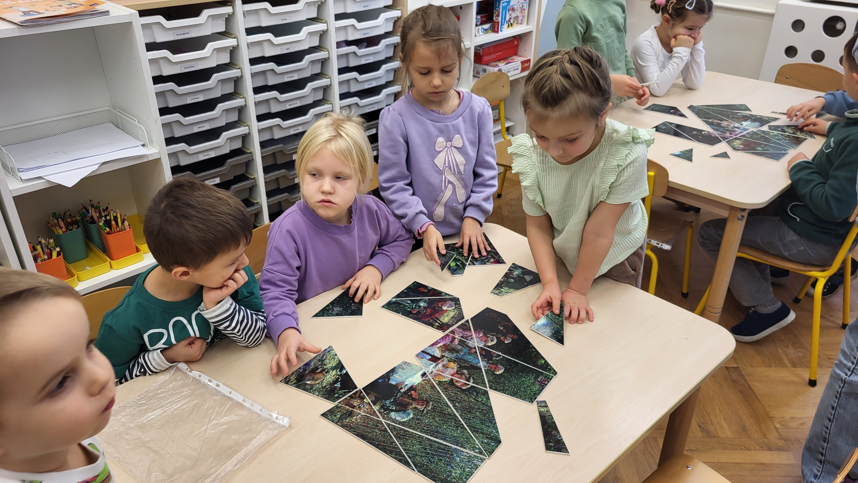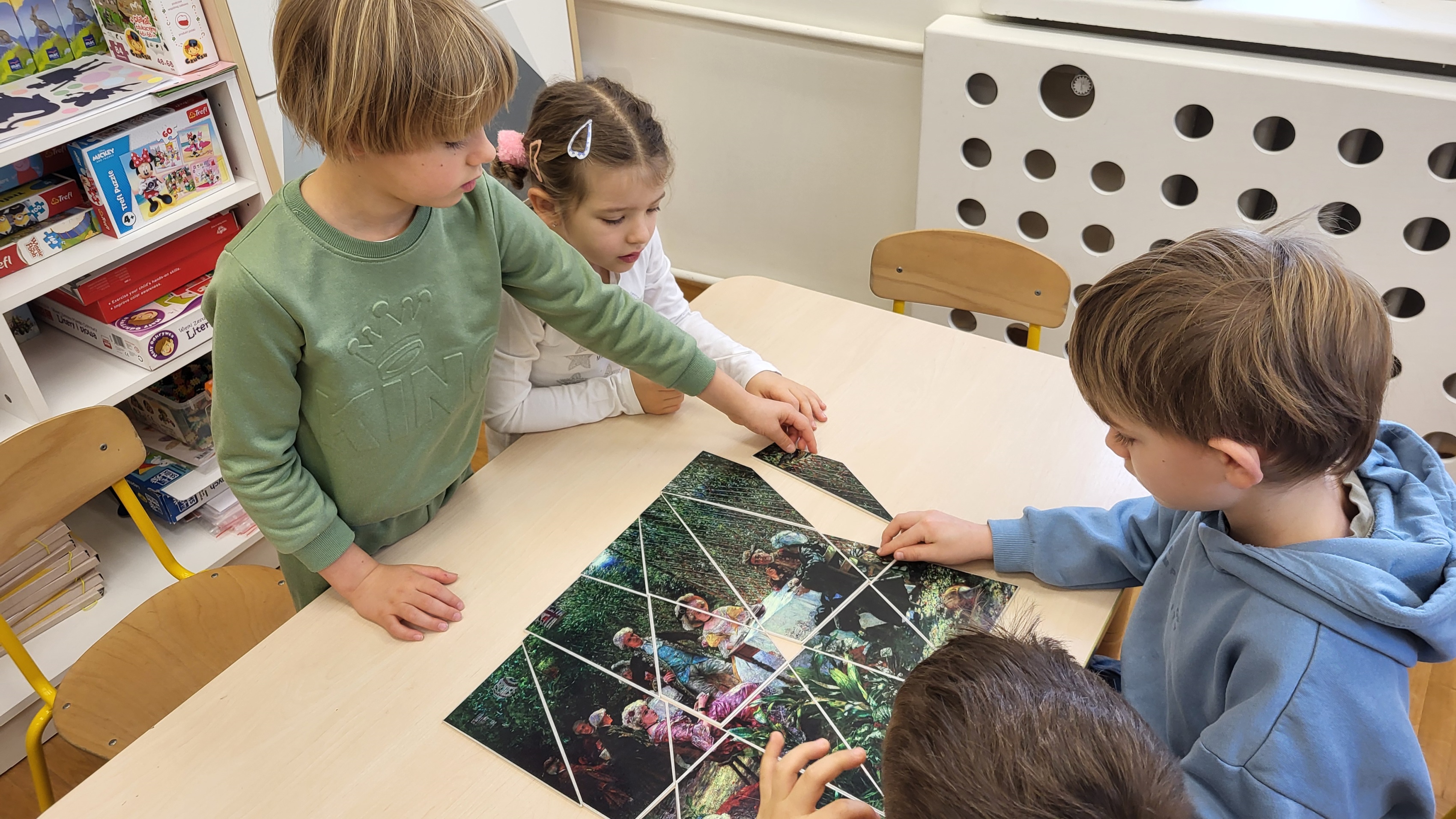 Podczas kolejnego spotkania w ramach projektu „ 6 obrazów dla 6 latka” dzieci poznały obraz Aleksandra Gierymskiego „W altanie”. Informacje o obrazie, artyście, który go stworzył i stylu, w jakich powstał są odkrywane przez dzieci w trakcie zabawy. W tym przypadku dzieci miały za zadanie ułożyć w grupach kopię obrazu z kilkunastu drobnych kawałków. Była to także doskonała nauka współpracy w zespole.