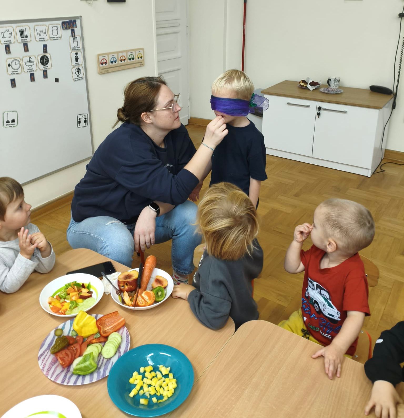 Dziś w grupie Biedronek odbyły się wyjątkowe zajęcia o zmysłach i poznawaniu smaków. Dzieci rozmawiały o tym, jak działają węch, słuch, smak i wzrok, a następnie — z zasłoniętymi oczami! — próbowały różnych warzyw i owoców.