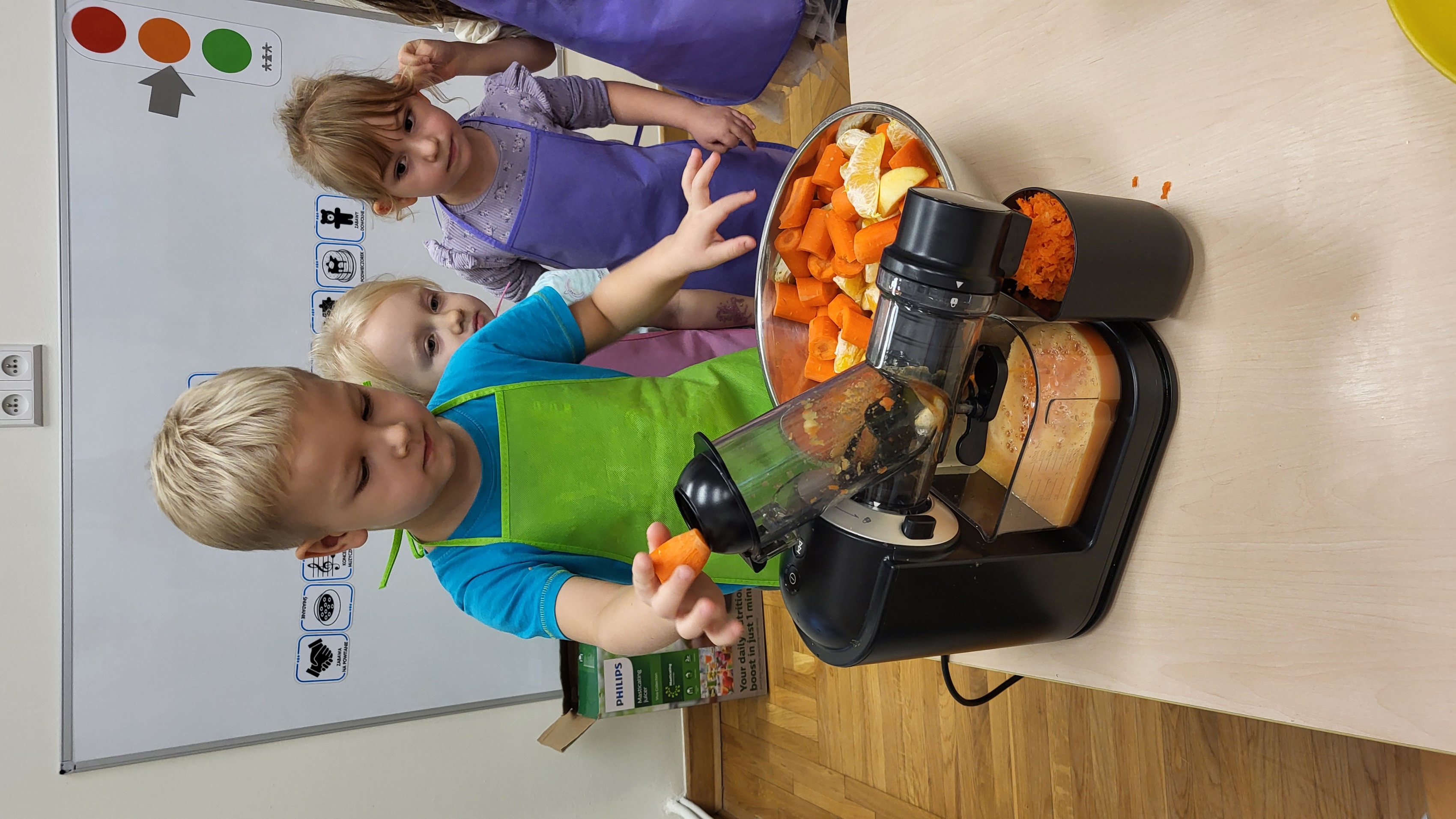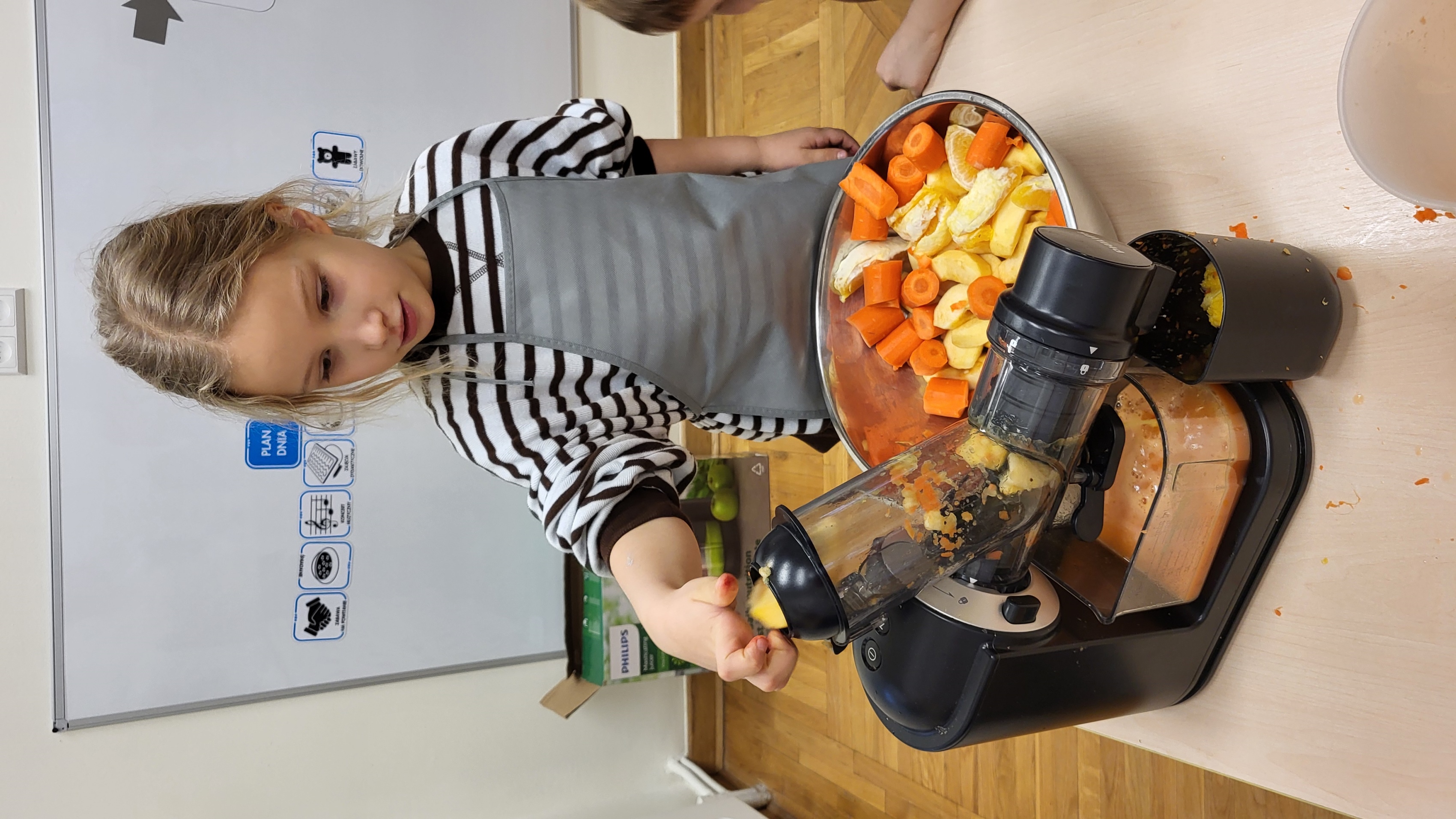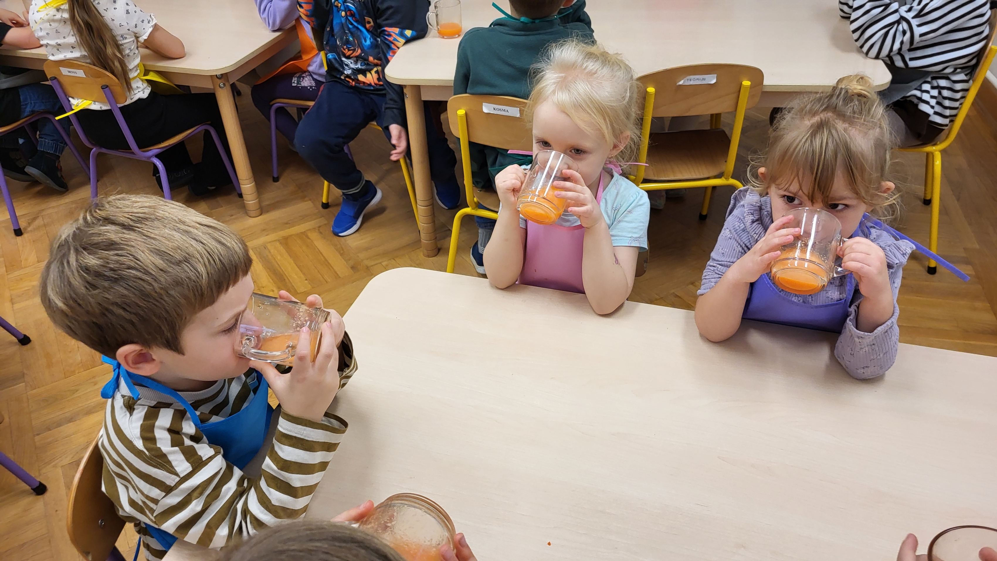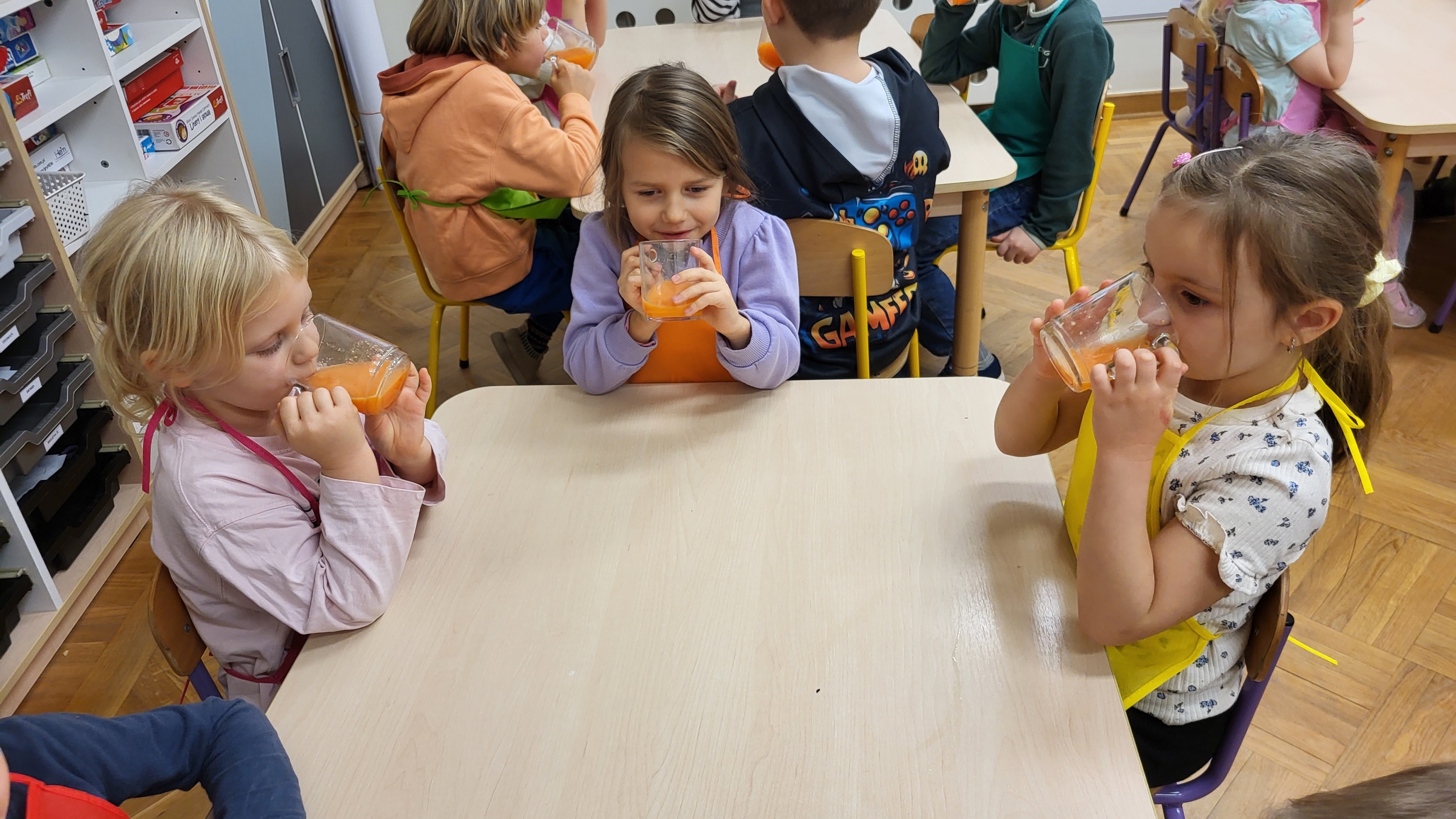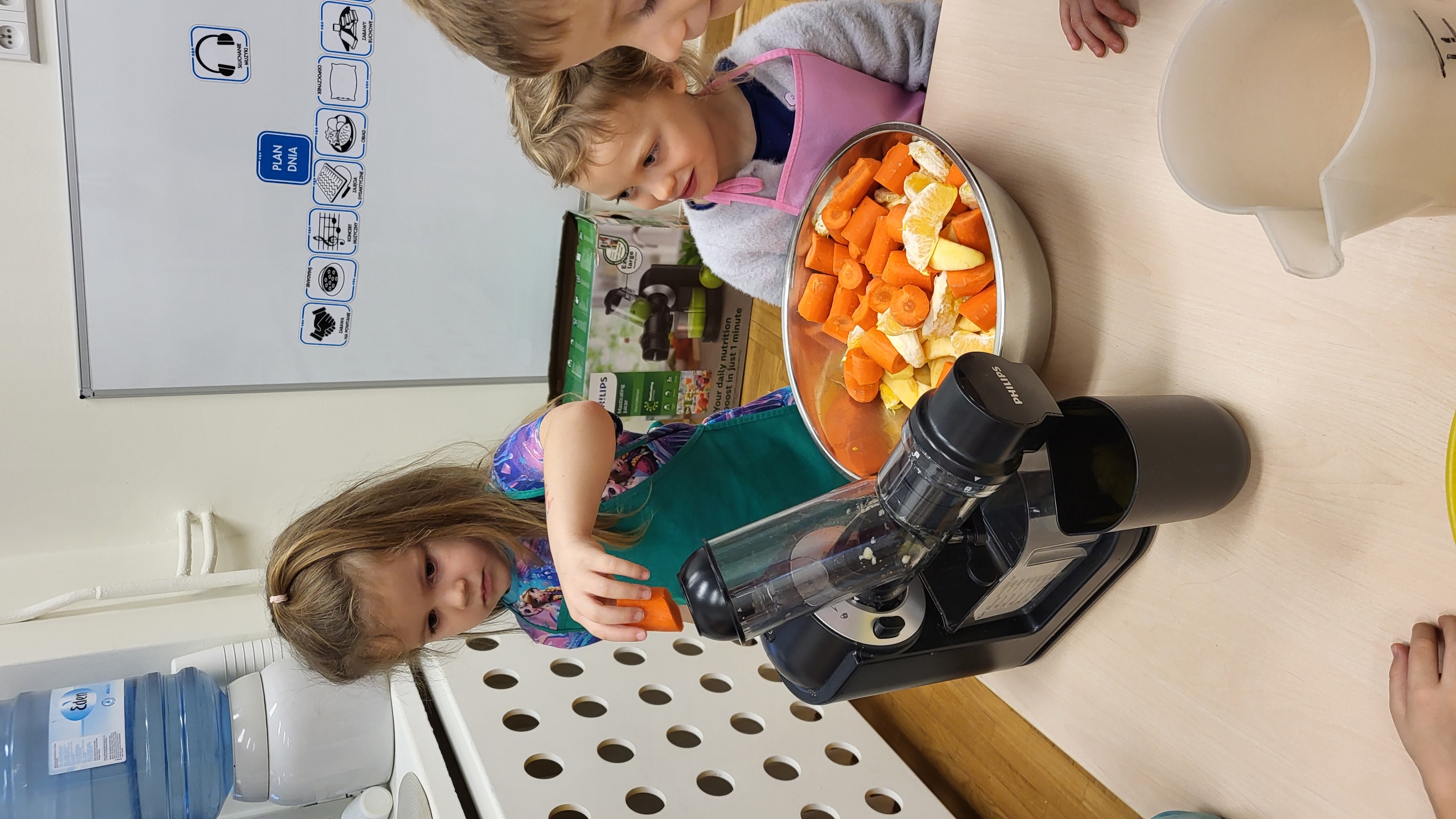 W naszym przedszkolu ten tydzień poświęcony był zdrowiu. Na wstępnie dzieci podały przykłady co należy robić aby być zdrowym, a następnie z zaangażowaniem przystąpiły do zadań promujących zdrowie Poznały zasady zdrowego odżywiania. W oparciu o piramidę zdrowego żywienia ustalały czy dany produkt jest zdrowy czy nie bardzo i do której grupy go zaliczamy. Dodatkową atrakcją było przygotowanie soku z owoców i warzyw. Dzieci z zaangażowaniem wykonały przepyszny napój, który wszystkim bardzo smakował. Dowiedziały się jak ważny dla zdrowia jest ruch i pobyt na świeżym powietrzu.