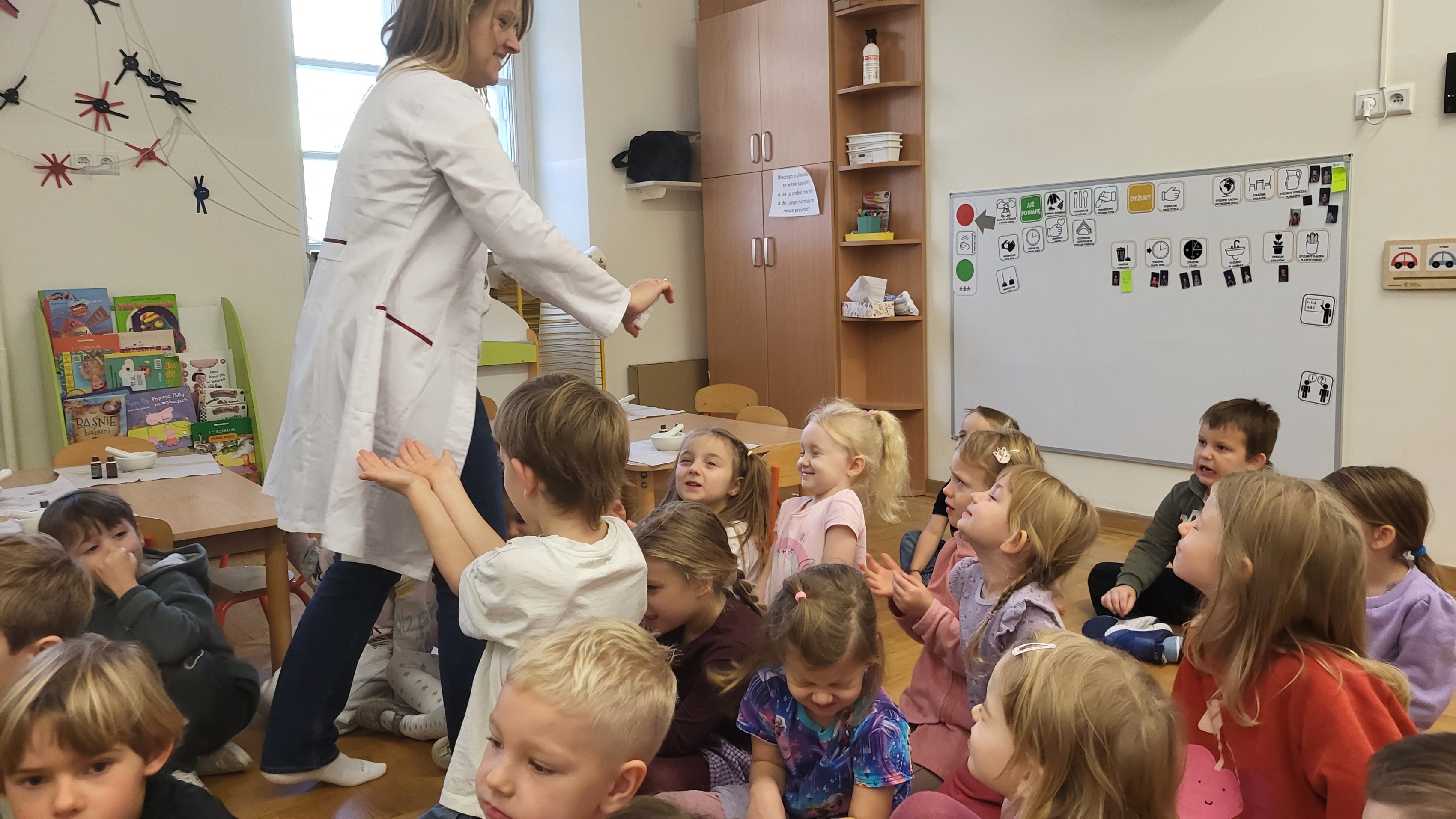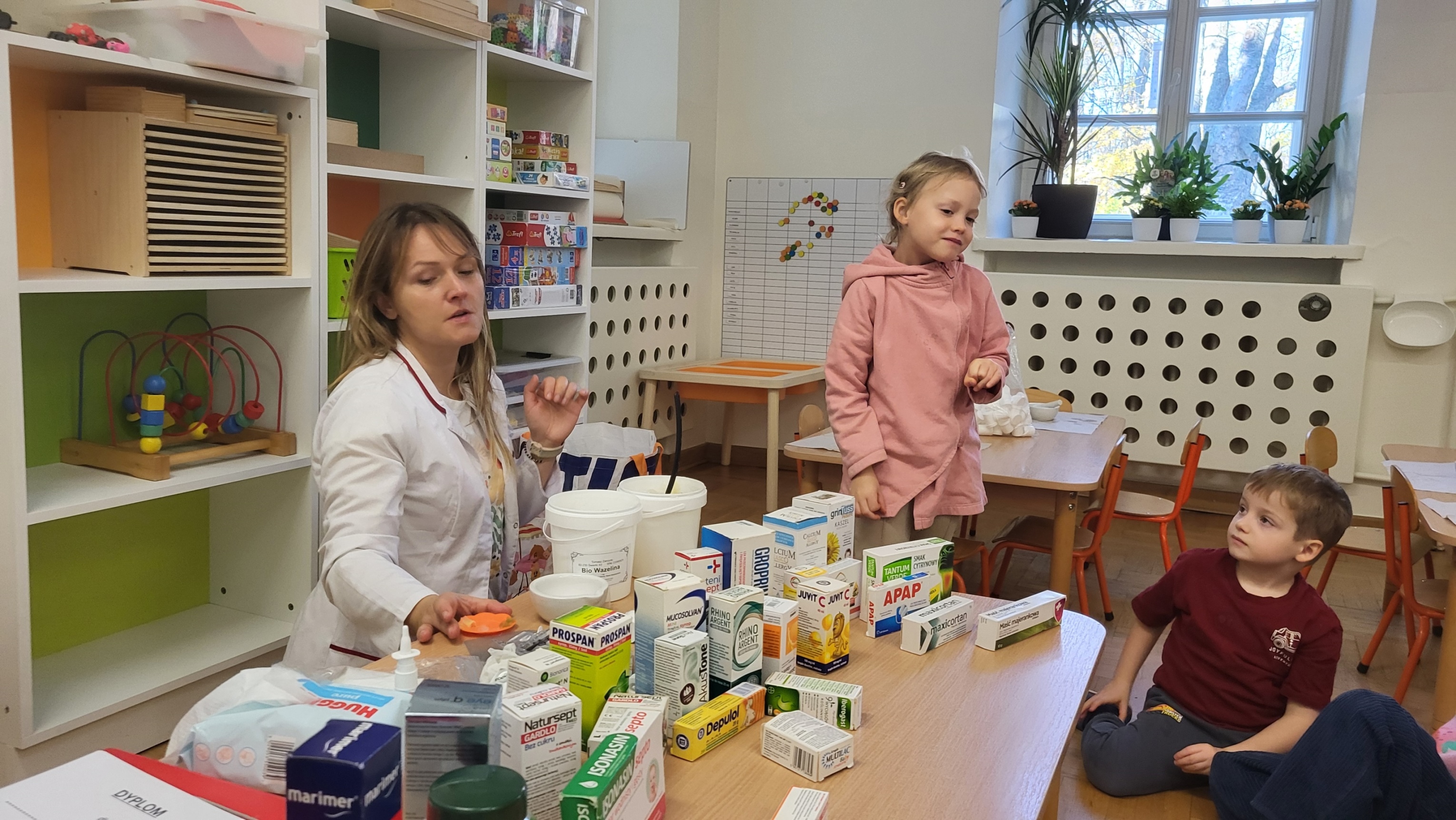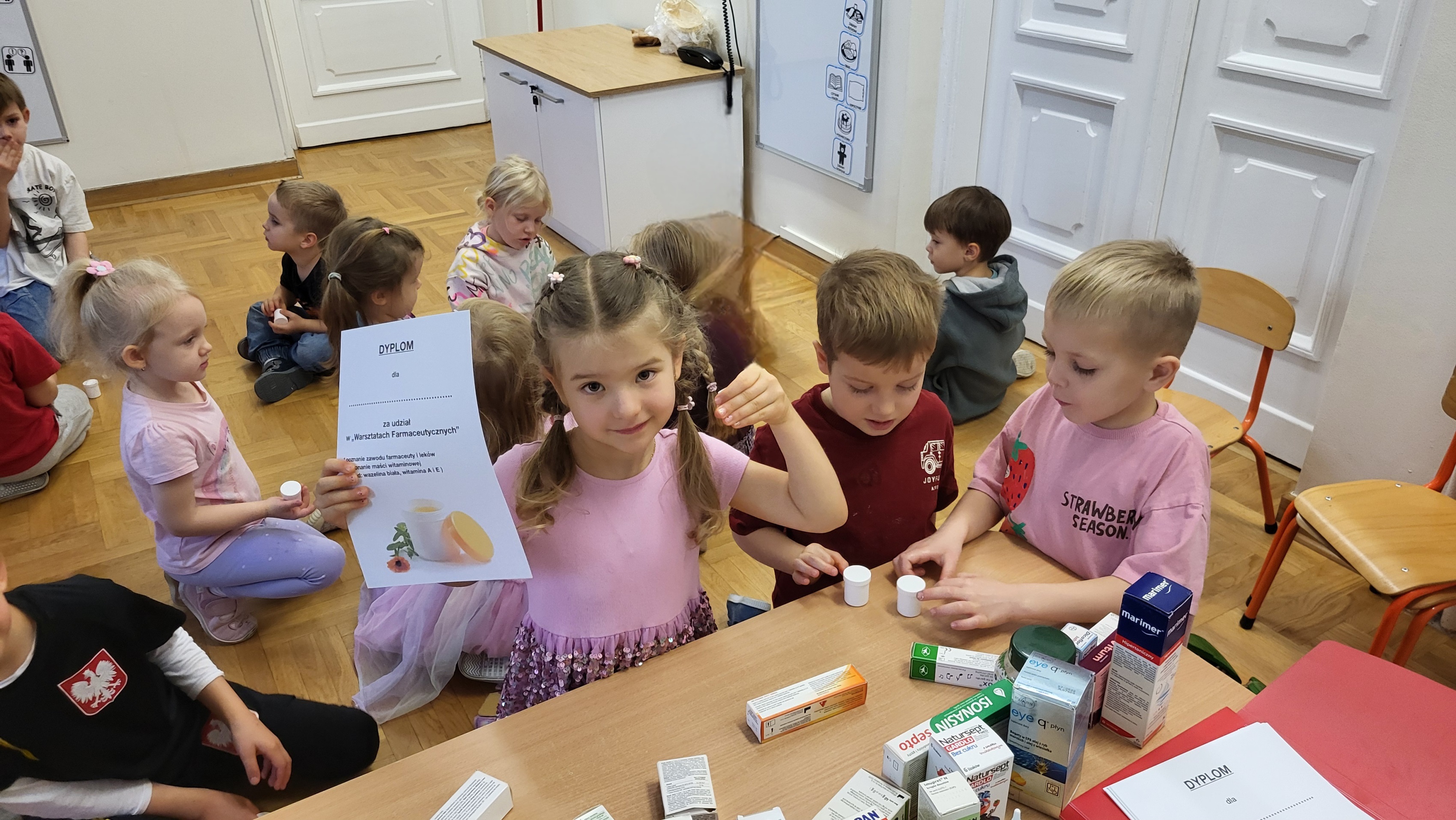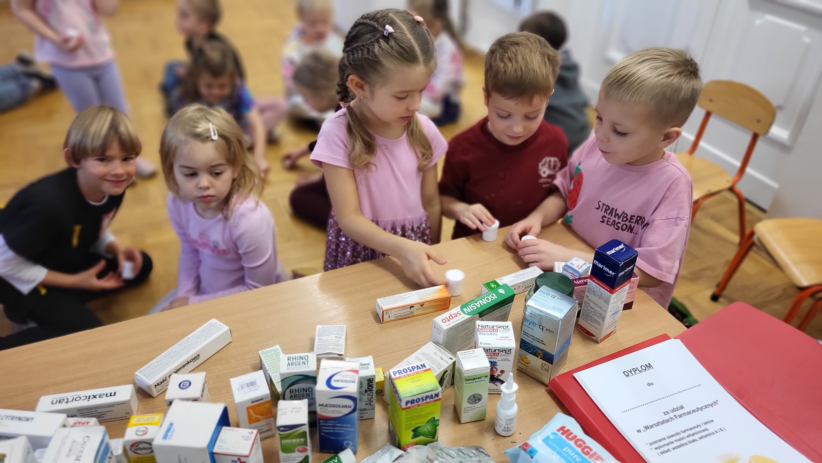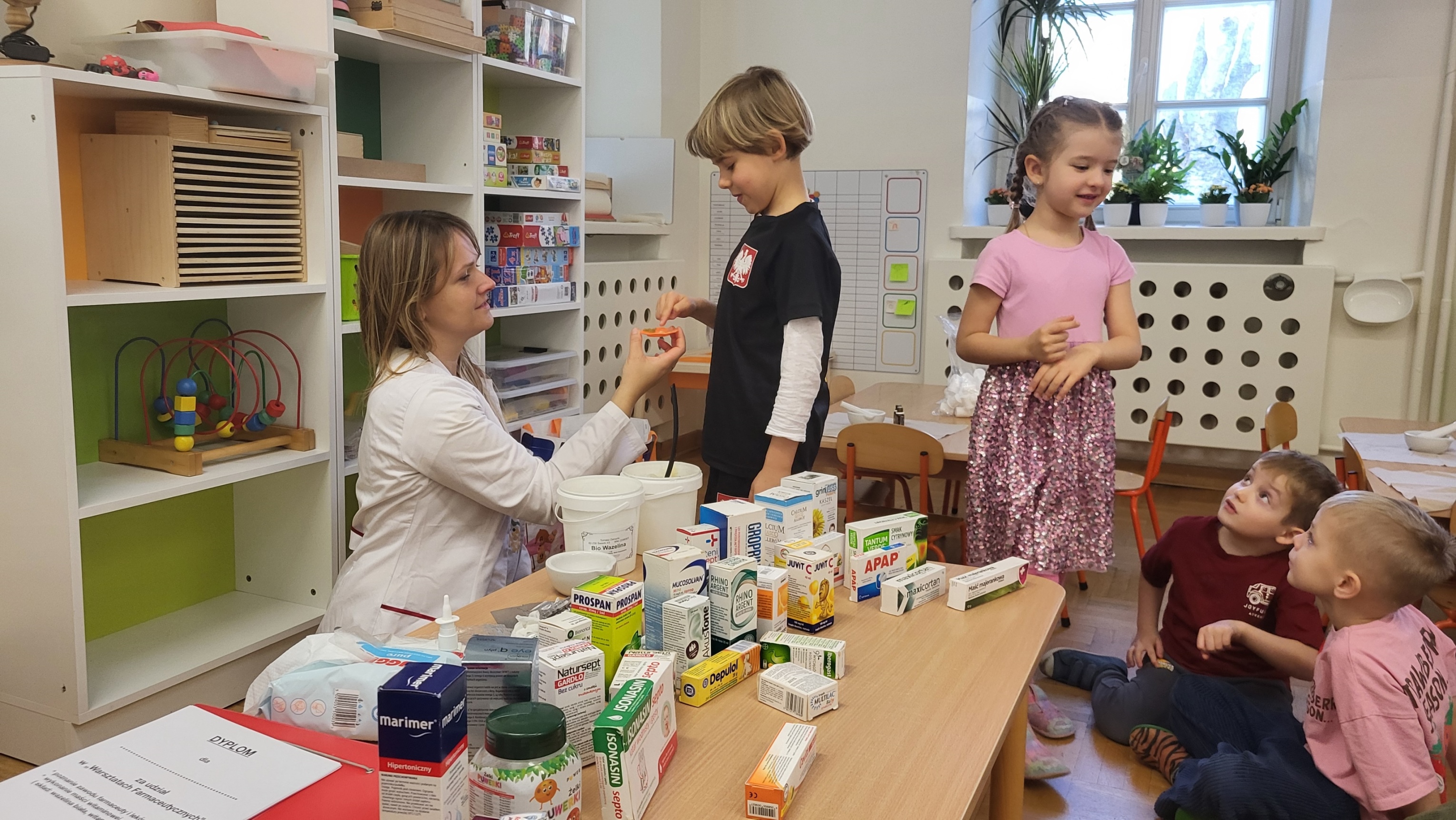 W grupie Motylki odbyło się spotkanie z Farmaceutą. Pani opowiedziała o asortymencie apteki, o przeznaczeniu różnych farmaceutycznych przyborów, a także wytłumaczyła dzieciom, czym jest lek i jakie jego postacie można otrzymać w aptece. Podkreśliła, że leki można przyjmować tylko jeśli jest się chorym i pod opieką dorosłych.. Podczas spotkania przedszkolaki dowiedziały się także jak wygląda i do czego służy recepta. Interesującym doświadczeniem było wykonywanie maści recepturowej. Dzieci z pomocą Pani Farmaceutki z wielkim zaangażowaniem ucierały w moździerzu składniki potrzebne do jej zrobienia. Po wykonaniu maści pani przełożyła ją do pudełeczka, które każde z dzieci zabrało do domu.