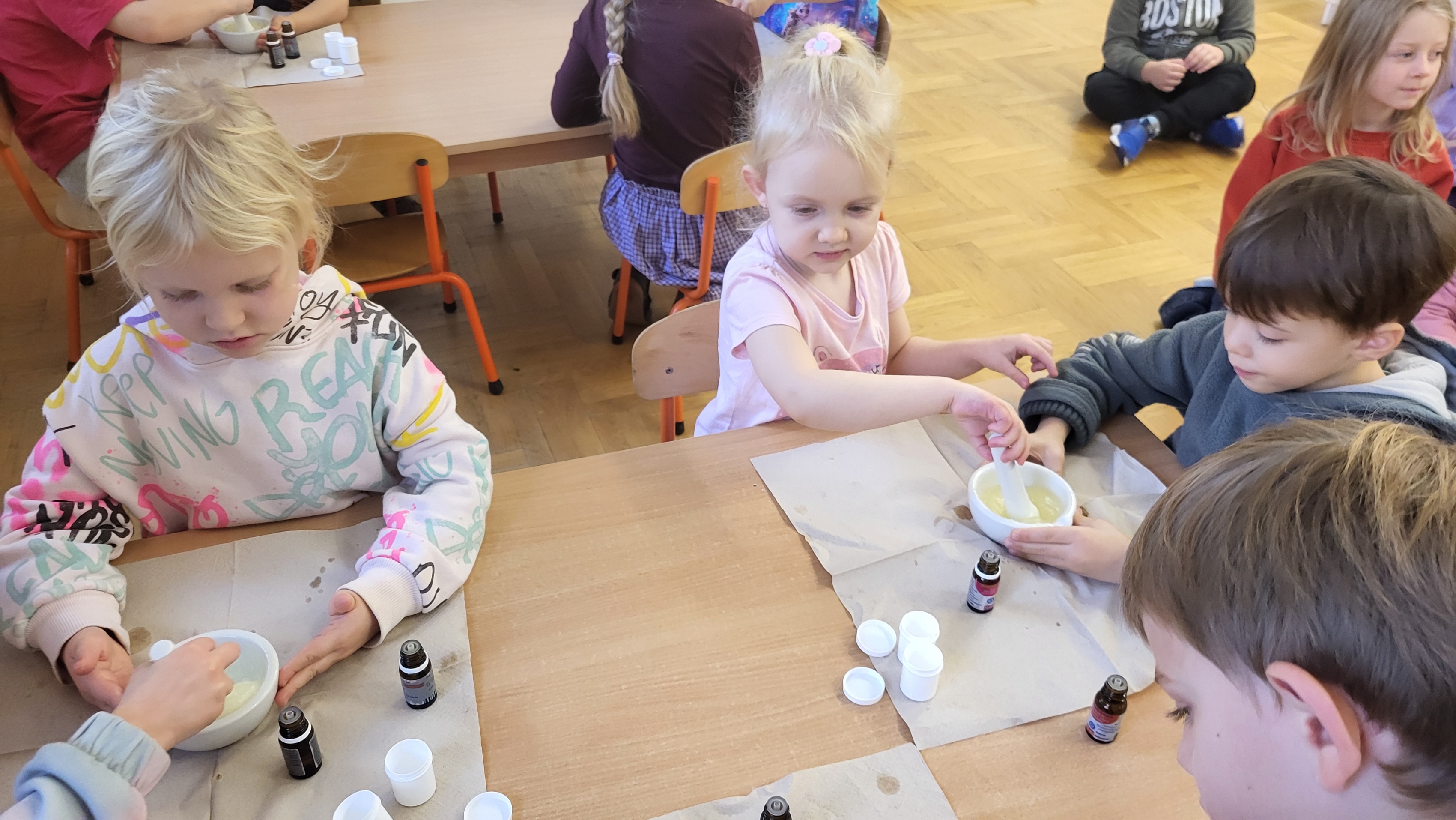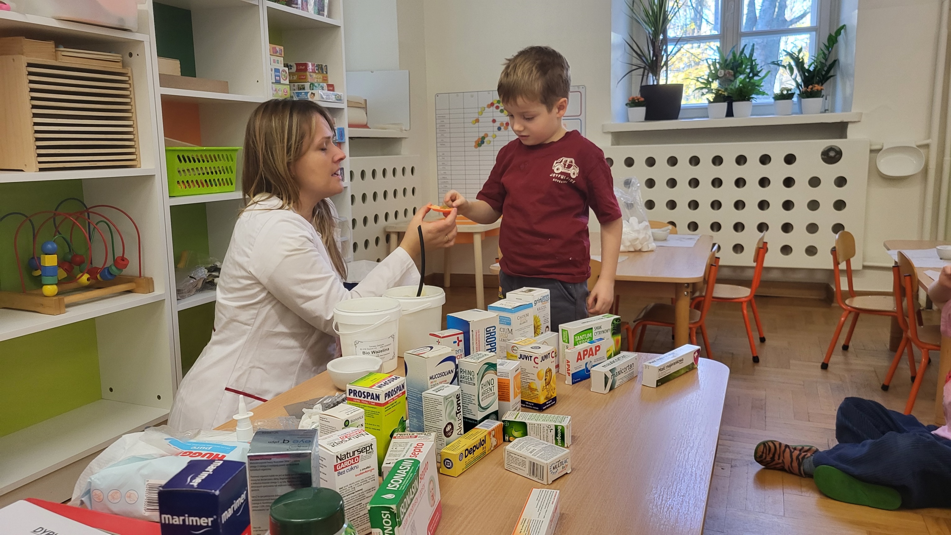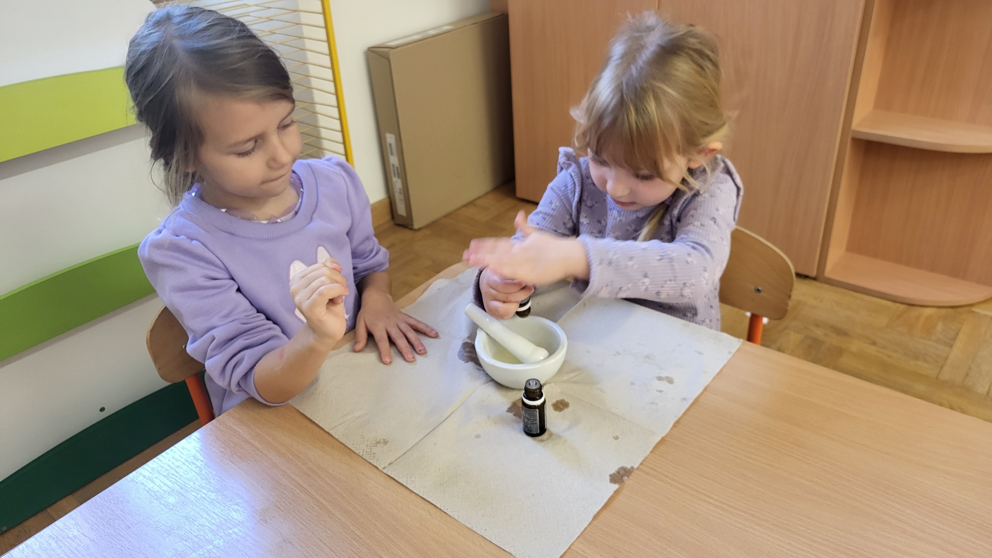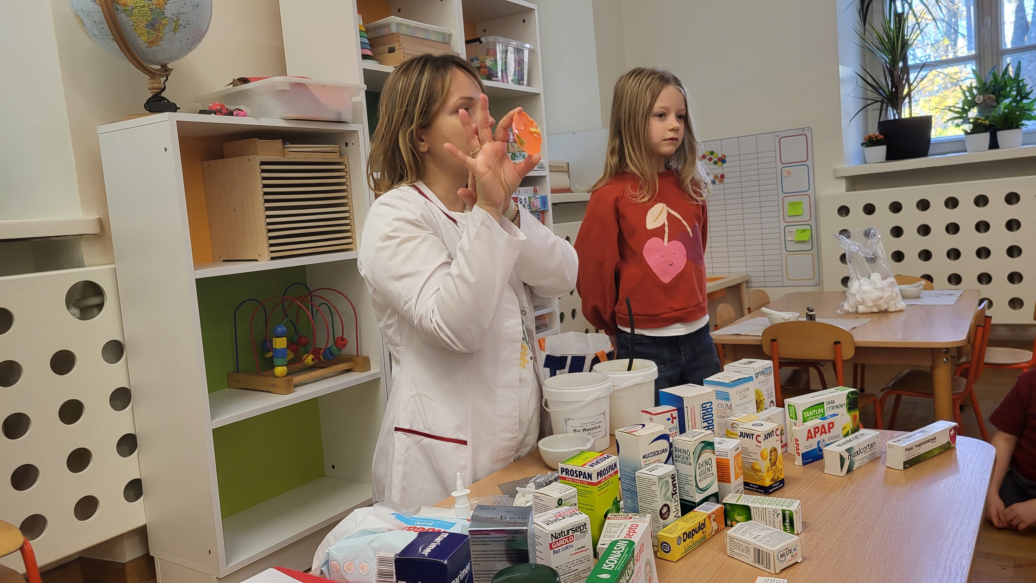 W grupie Motylki odbyło się spotkanie z Farmaceutą. Pani opowiedziała o asortymencie apteki, o przeznaczeniu różnych farmaceutycznych przyborów, a także wytłumaczyła dzieciom, czym jest lek i jakie jego postacie można otrzymać w aptece. Podkreśliła, że leki można przyjmować tylko jeśli jest się chorym i pod opieką dorosłych.. Podczas spotkania przedszkolaki dowiedziały się także jak wygląda i do czego służy recepta. Interesującym doświadczeniem było wykonywanie maści recepturowej. Dzieci z pomocą Pani Farmaceutki z wielkim zaangażowaniem ucierały w moździerzu składniki potrzebne do jej zrobienia. Po wykonaniu maści pani przełożyła ją do pudełeczka, które każde z dzieci zabrało do domu.
