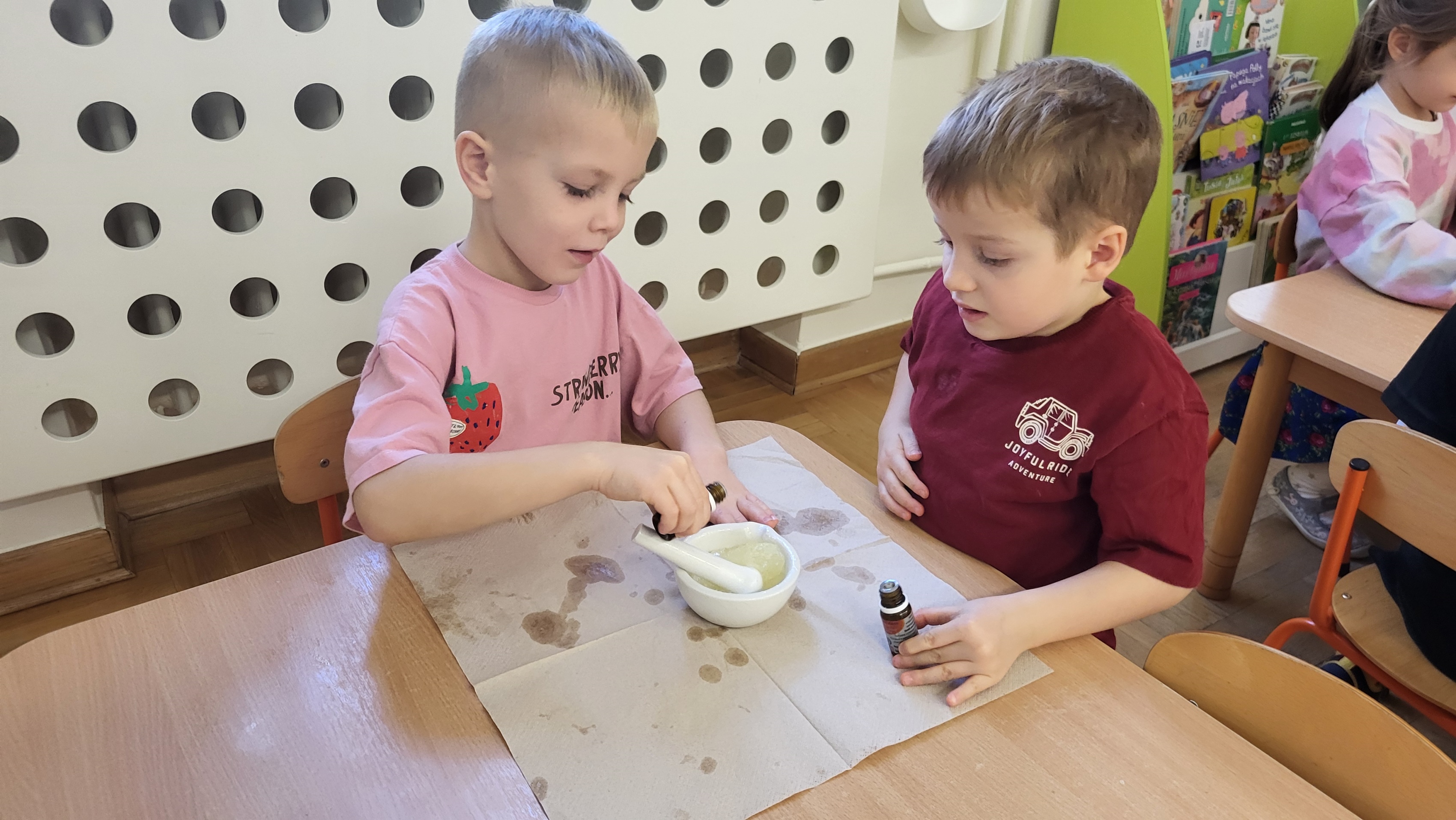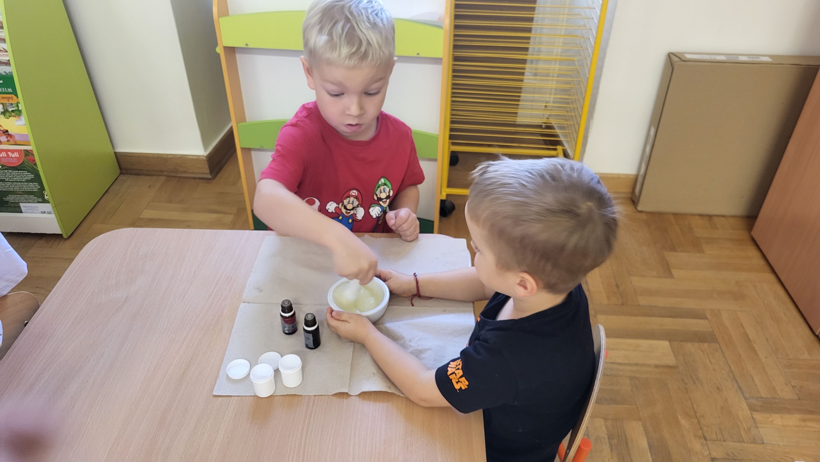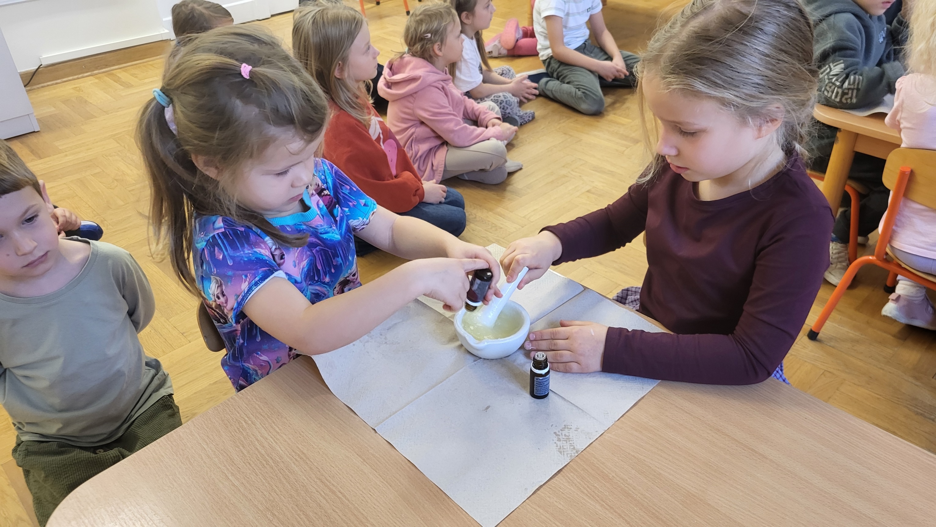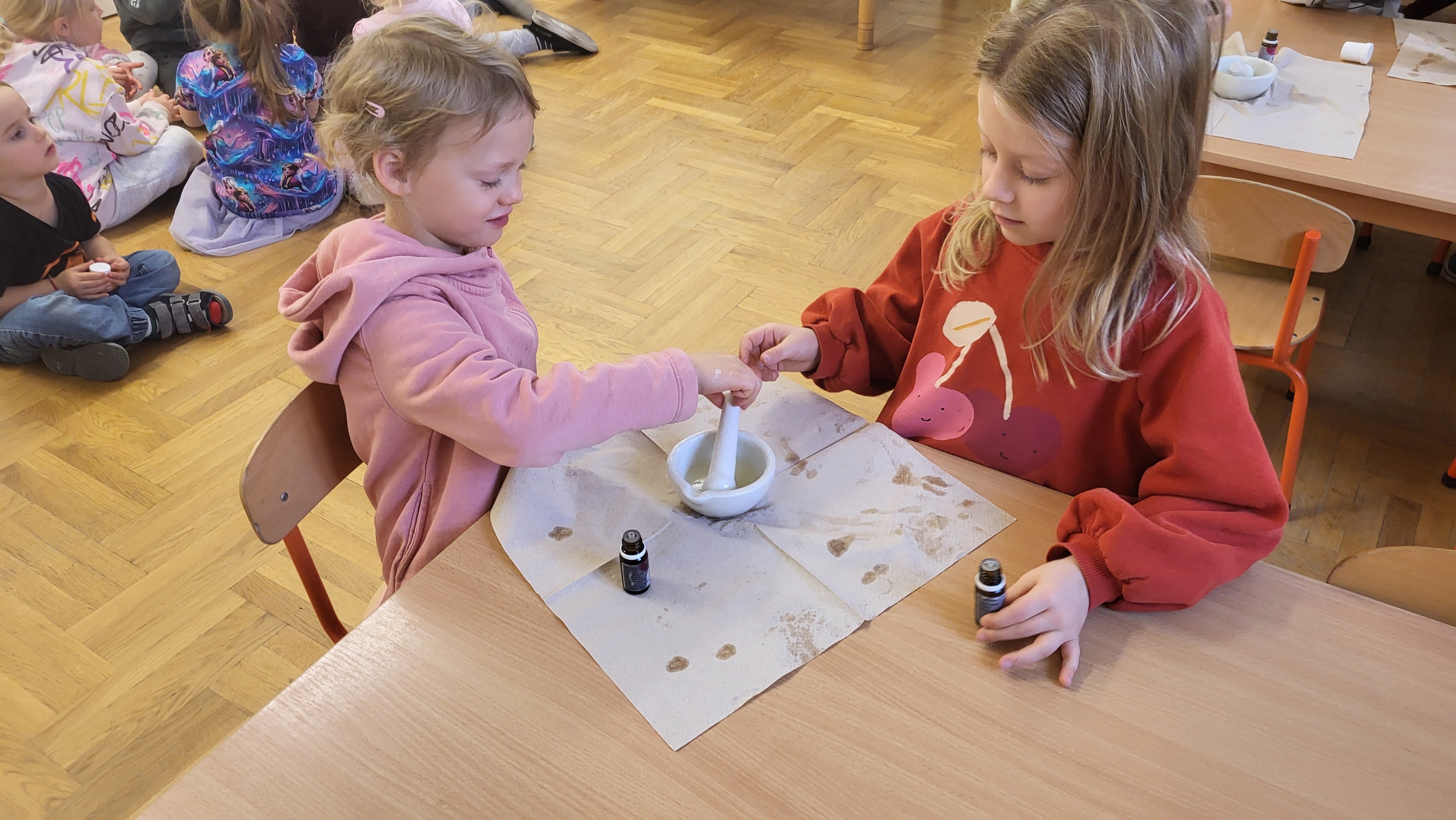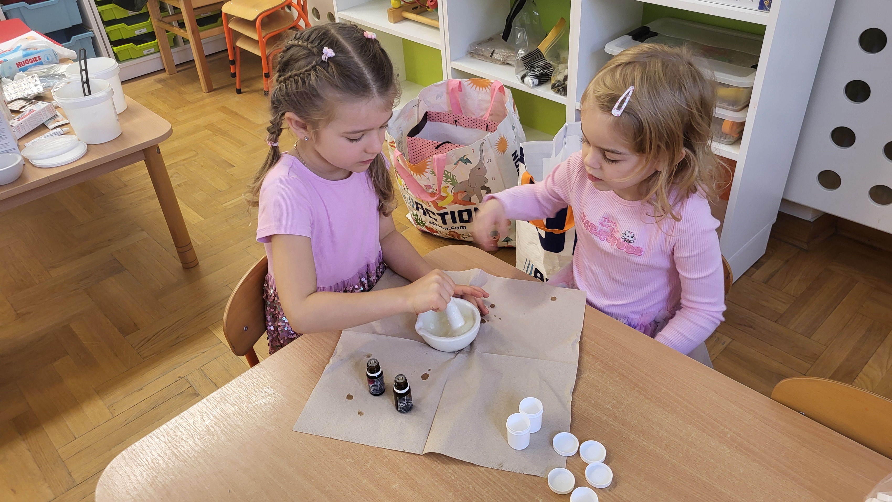 W grupie Motylki odbyło się spotkanie z Farmaceutą. Pani opowiedziała o asortymencie apteki, o przeznaczeniu różnych farmaceutycznych przyborów, a także wytłumaczyła dzieciom, czym jest lek i jakie jego postacie można otrzymać w aptece. Podkreśliła, że leki można przyjmować tylko jeśli jest się chorym i pod opieką dorosłych.. Podczas spotkania przedszkolaki dowiedziały się także jak wygląda i do czego służy recepta. Interesującym doświadczeniem było wykonywanie maści recepturowej. Dzieci z pomocą Pani Farmaceutki z wielkim zaangażowaniem ucierały w moździerzu składniki potrzebne do jej zrobienia. Po wykonaniu maści pani przełożyła ją do pudełeczka, które każde z dzieci zabrało do domu.