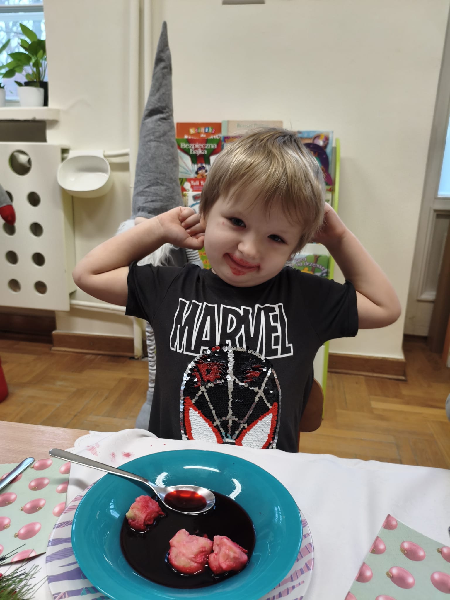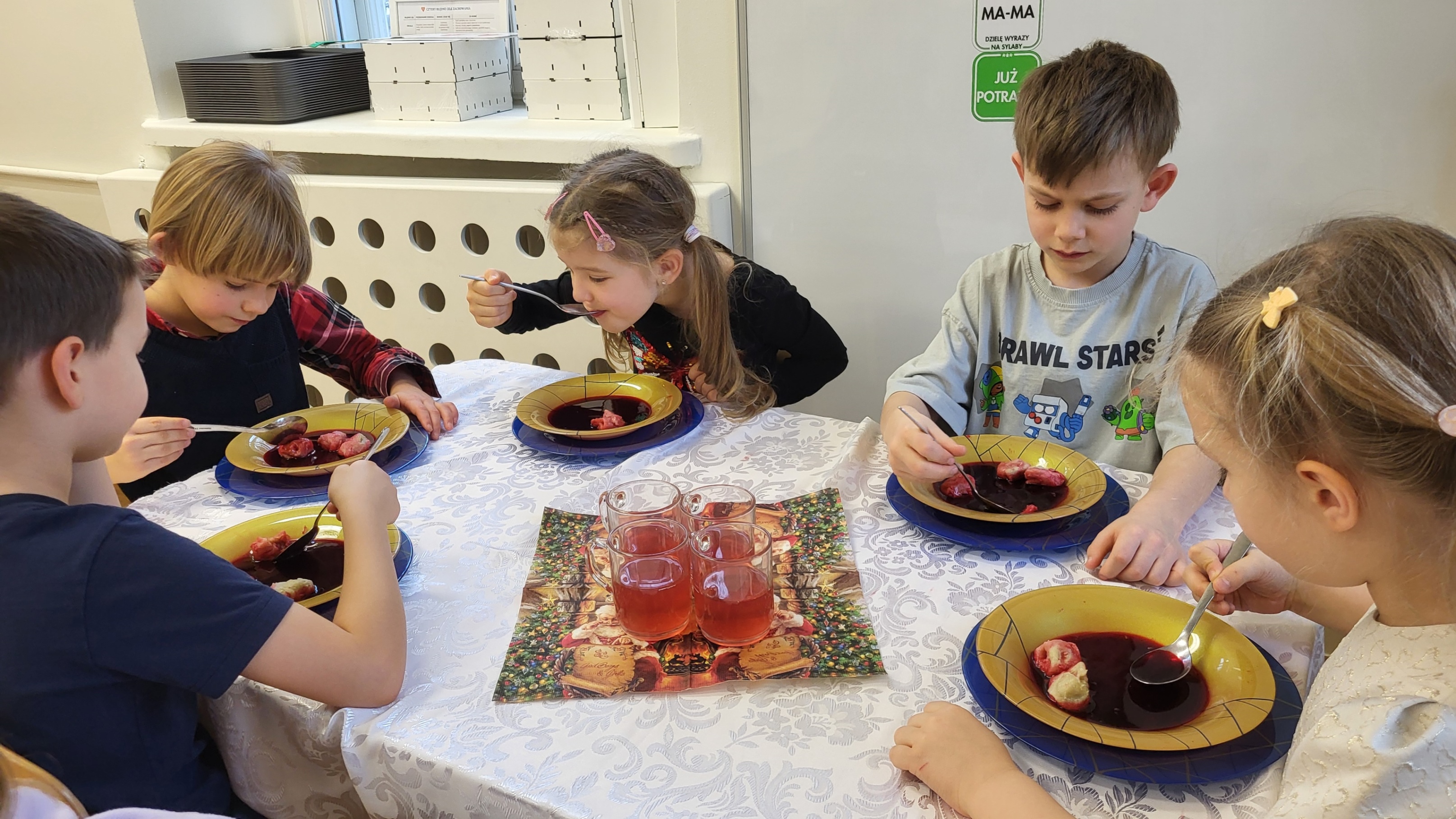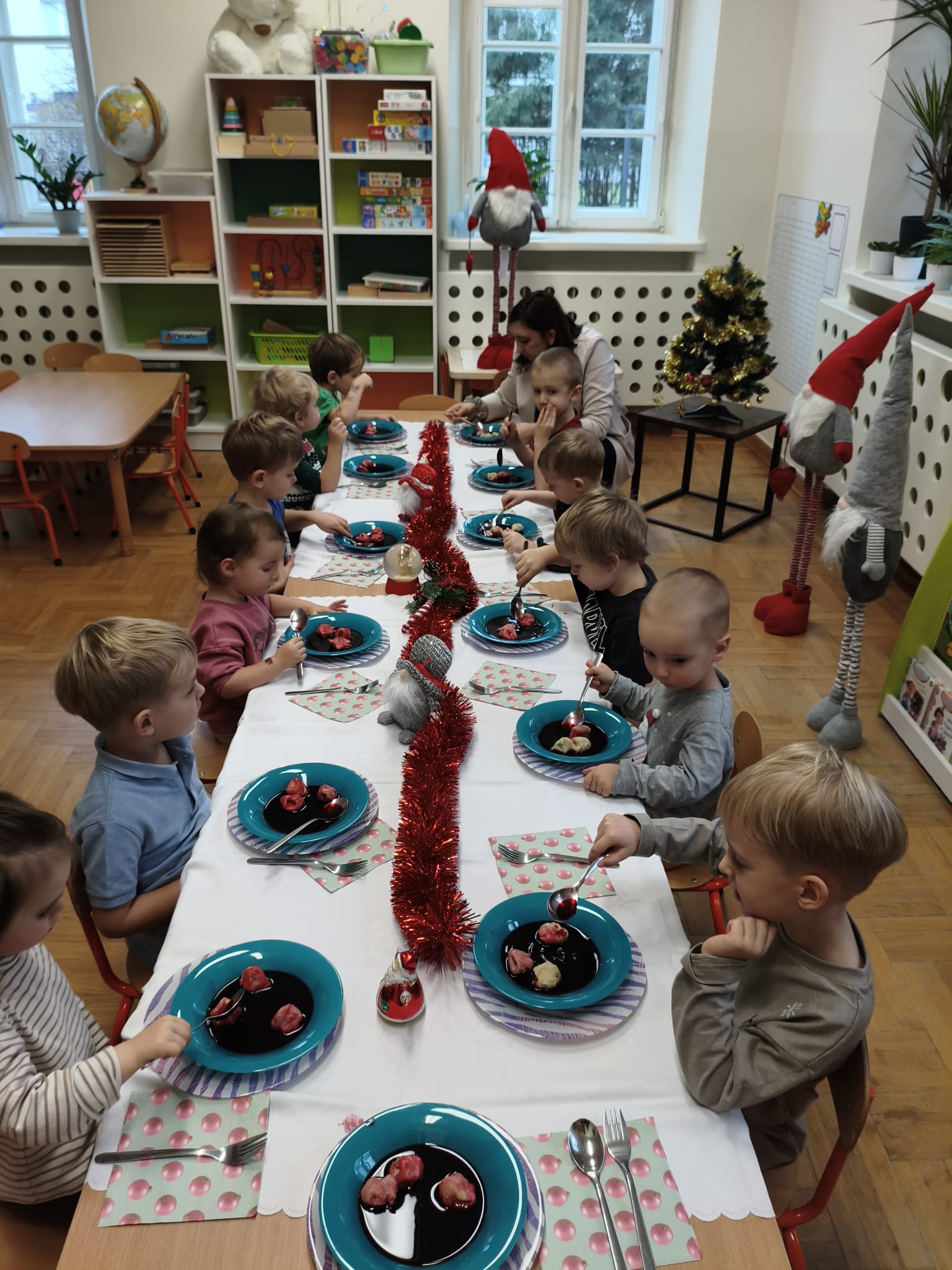 Święta to jedne z najpiękniejszych dni w roku, na który wszyscy czekamy i przeżywamy go uroczyście. W naszym przedszkolu dzieci każdego roku poznają tradycje i zwyczaje świąteczne i chętnie uczestniczą w przygotowaniach. 18 grudnia odbył się wspólny, uroczysty obiad. Dzieci składały sobie życzenia pielęgnując przyjaźnie i ucząc się aktywnego słuchania siebie nawzajem. Ze smakiem zjadły barszcz z uszkami oraz pierogi, będące tradycyjną polską potrawą świąteczną, oraz faszerowanego indyka - świąteczny przysmak pochodzący z Anglii. Czas upłynął w bardzo miłej, serdecznej atmosferze.