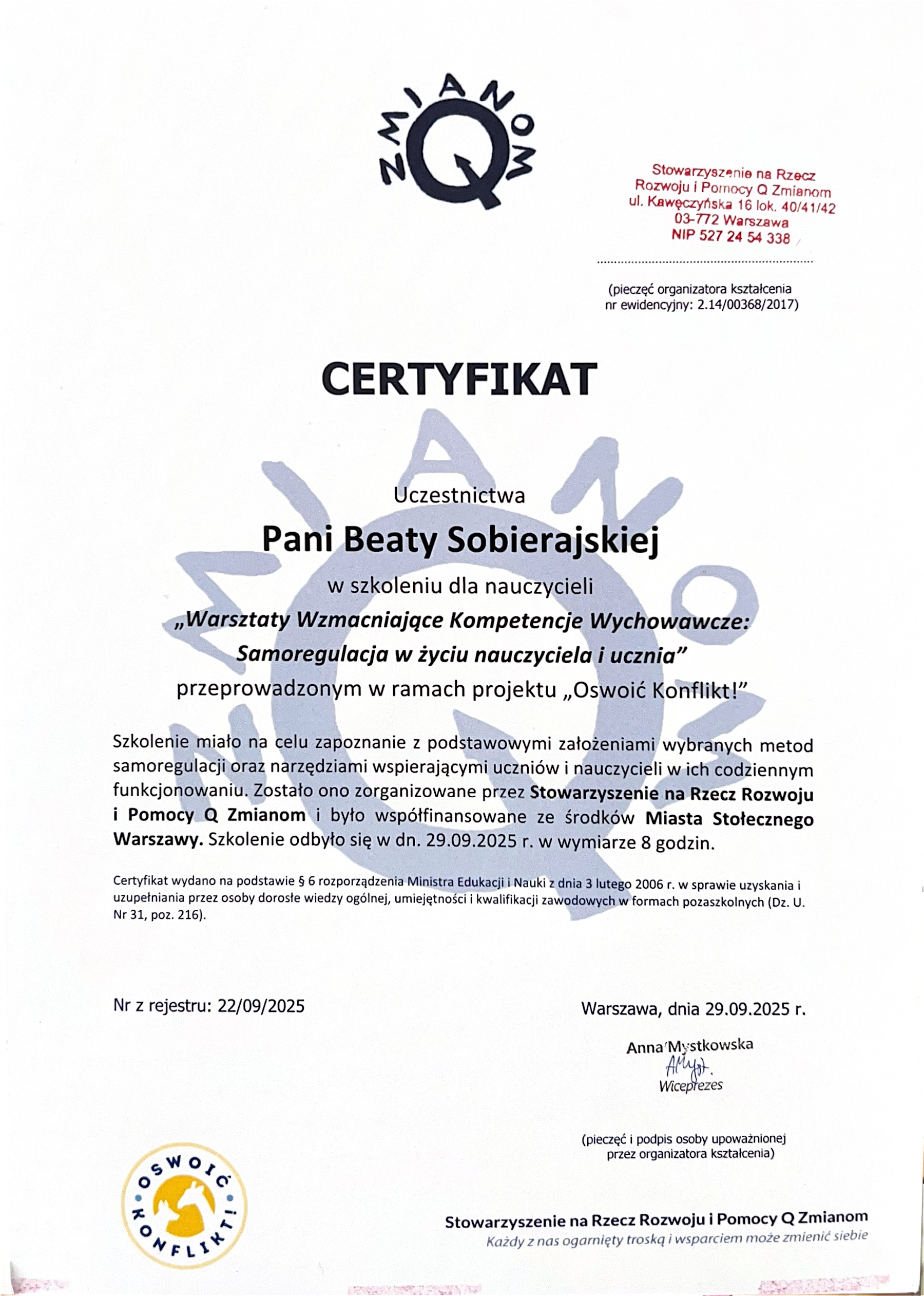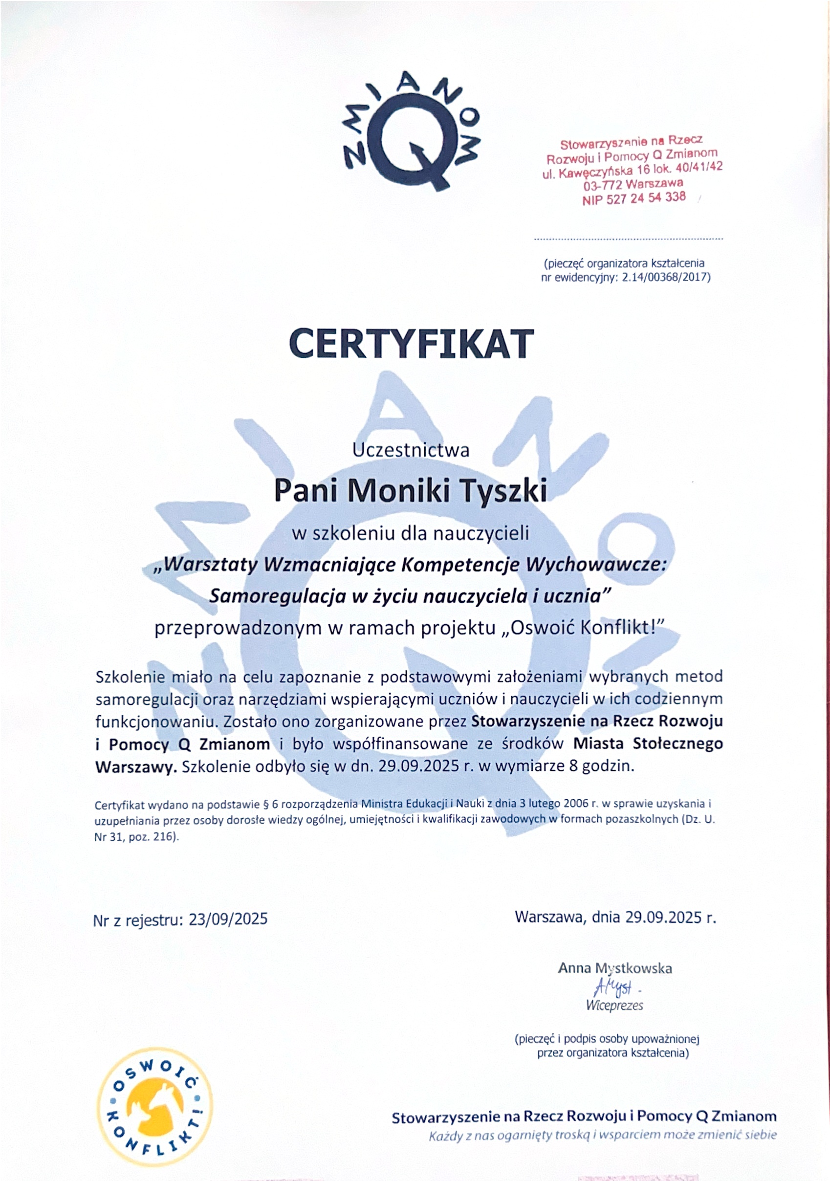 Z dumą informujemy, że nasze nauczycielki wzięły udział w szkoleniu „Warsztaty Wzmacniające Kompetencje Wychowawcze: Samoregulacja w życiu nauczyciela i ucznia”, przeprowadzonym w ramach projektu „Oswoić Konflikt” organizowanego przez Stowarzyszenie na Rzecz Rozwoju i Pomocy Q Zmianom.